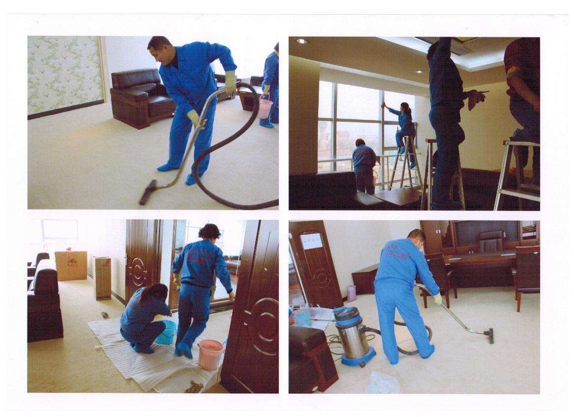 6、 地面清洗:著重處理開荒保潔遺留下的漆點、膠點等污漬,然后用清洗機對地面進行清洗。